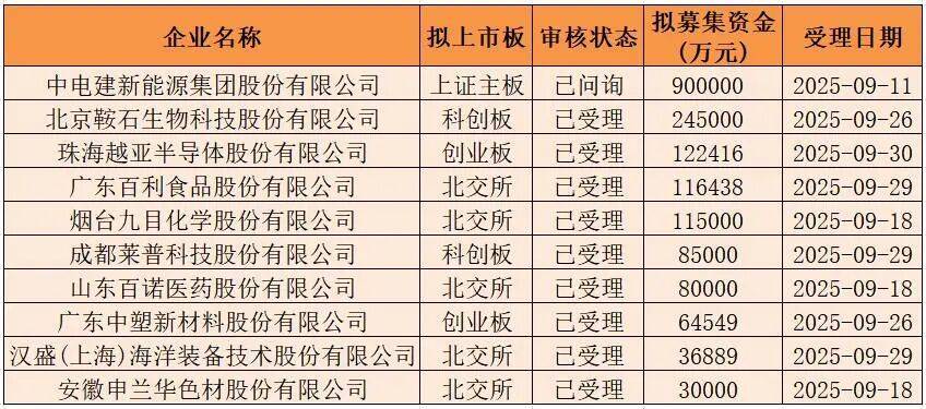 从募资金额看,9月新受理的10家IPO合计募资179.53亿元,其中拟闯关上证主板IPO的电建新能募资金额90亿元,居首位。