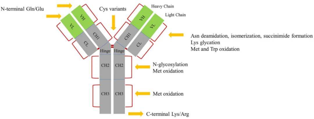 翻译后修饰是导致蛋白质电荷异质性的最主要原因,不同的修饰类型会赋予蛋白质不同的电荷特性。下图展示了产生电荷变异的主要 PTM 和 IgG1 分子上修饰氨基酸残基位置。