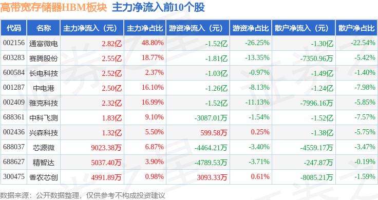 从资金流向上来看,当日高带宽存储器HBM板块主力资金净流入12.37亿元,游资资金净流出4.81亿元,散户资金净流出7.56亿元。高带宽存储器HBM板块个股资金流向见下表: