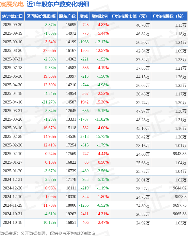 从股价来看,2025年9月19日至2025年9月30日,宸展光电区间跌幅为8.87%,在此期间股东户数增加723.0户,增幅为4.83%。