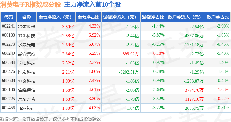 资金流向方面,消费电子R(480030)指数成份股当日主力资金净流出合计8.49亿元,游资资金净流出合计4815.59万元,散户资金净流入合计8.97亿元。成份股资金流向详情见下表: