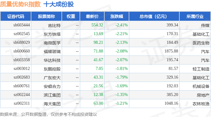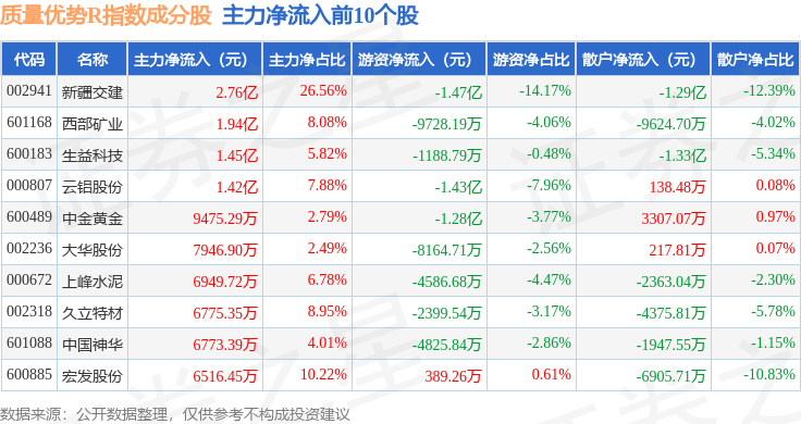 资金流向方面,质量优势R(489017)指数成份股当日主力资金净流出合计11.76亿元,游资资金净流出合计1.63亿元,散户资金净流入合计13.39亿元。成份股资金流向详情见下表: