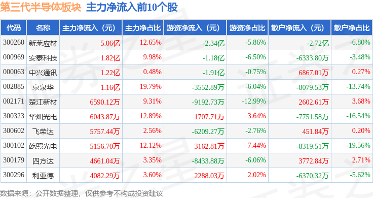 从资金流向上来看,当日第三代半导体板块主力资金净流出109.42亿元,游资资金净流入30.41亿元,散户资金净流入79.01亿元。第三代半导体板块个股资金流向见下表: