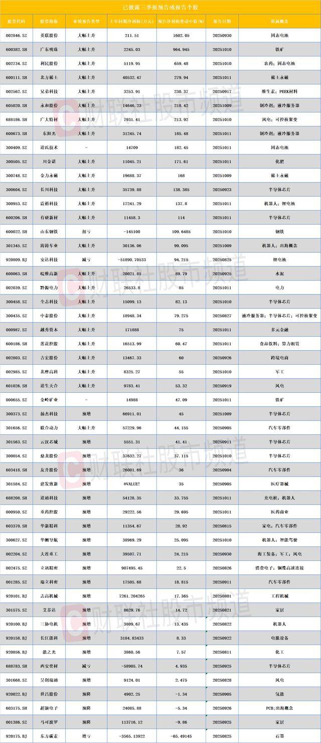上表按净利润变动中值排序列出了已披露三季报预告或报告的个股情况,其中英联股份2025年前三季度净利润预计同比增长1531.13%–1672.97%暂居首位,此外广大特材、永和股份、兄弟科技、北方稀土、利民股份、广东明珠等个股前三季度净利预增超200%。