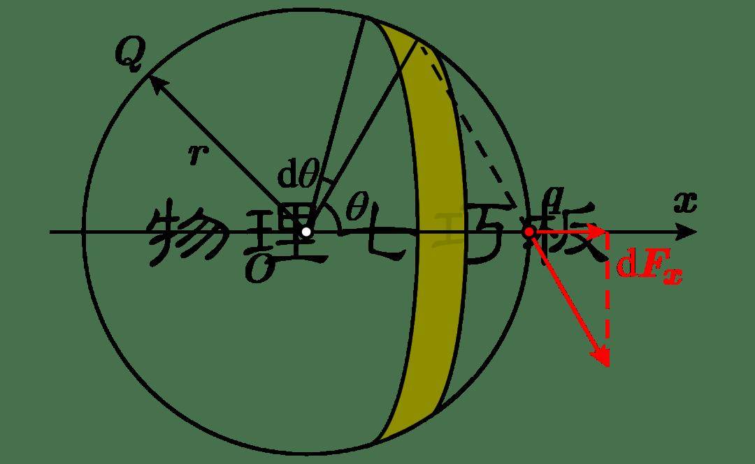 以球心为原点,指向点电荷方向为正方向定为轴正方向,如图所示。与轴夹角为处取微小角度,以轴为转轴旋转一圈,形成一条窄带,其面积用表示。由于对称性,这一条窄带对点电荷的作用力沿着轴正方向。