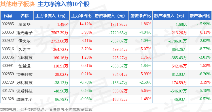 从资金流向上来看,当日其他电子板块主力资金净流出7.09亿元,游资资金净流入1.41亿元,散户资金净流入5.68亿元。其他电子板块个股资金流向见下表:
