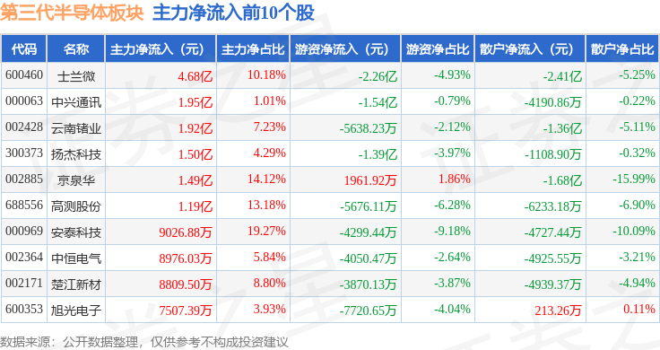 从资金流向上来看,当日第三代半导体板块主力资金净流出24.07亿元,游资资金净流入4.23亿元,散户资金净流入19.84亿元。第三代半导体板块个股资金流向见下表: