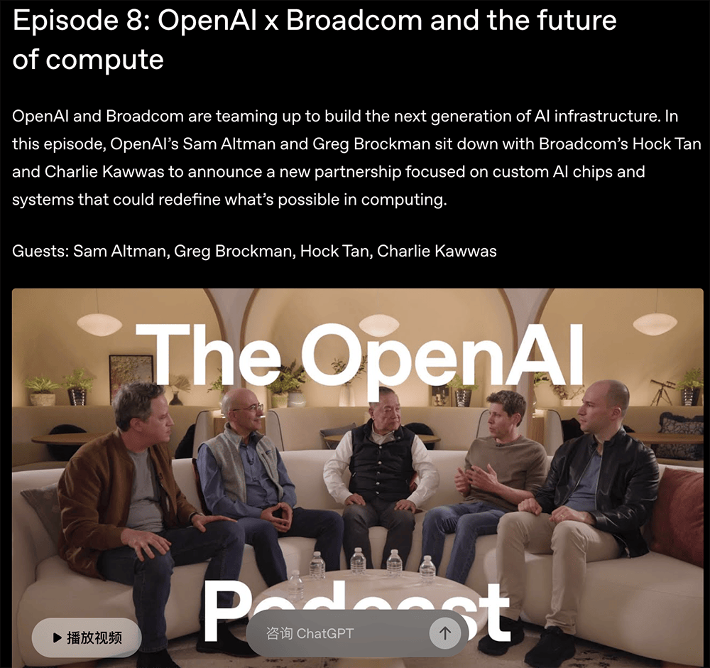 OpenAI发布了时长28分钟的播客,详细介绍与博通的合作进展。OpenAI联合创始人兼CEO Sam Altman、OpenAI联合创始人兼总裁Greg Brockman、博通总裁兼CEO陈福阳、博通半导体解决方案事业部总裁Charlie Kawwas在坐在一起,分享双方合作定制AI芯片和系统如何重新定义计算的可能。
