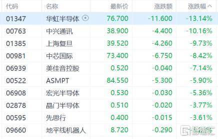 芯片、半导体股全线走低,华虹半导体跌超13%,中兴通讯跌超10%,上海复旦跌超9%,中芯国际、晶门半导体等跟跌。