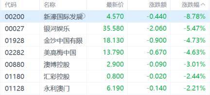 濠赌股延续下跌行情,新濠国际发展跌超8%,银河娱乐跌超5%,金沙中国、美高梅中国、永利澳门等跟跌。