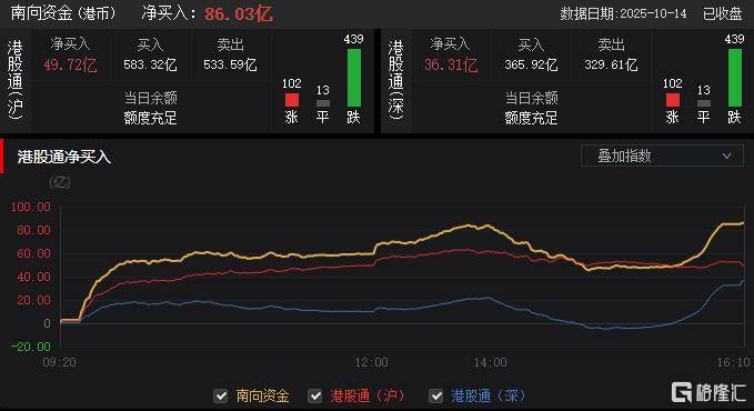 今日,南向资金净买入86.03亿港元,其中港股通(沪)净买入49.72亿港元,港股通(深)净买入36.31亿港元。