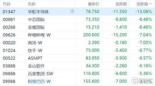 大型科技股普跌,华虹半导体跌超13%,中芯国际、金蝶国际跌超8%,哔哩哔哩-W、商汤-W跌超7%,快手-W、金山软件等跟跌。