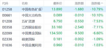 铜业股走弱,中国有色矿业、中国大冶有色跌超10%,五矿资源、江西铜业股份跌超7%,中国黄金国际跟跌。