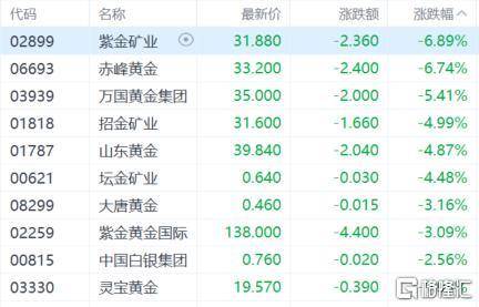 黄金股及贵金属股高开低走,紫金矿业、赤峰黄金跌超6%,万国黄金集团跌超5%,招金矿业、大唐黄金等跟跌。