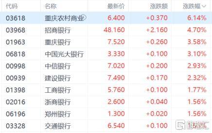 内银股震荡走高,重庆农村商业银行涨超6%,招商银行涨超4%,重庆银行、中国光大银行涨超3%,中信银行、建设银行等跟涨。