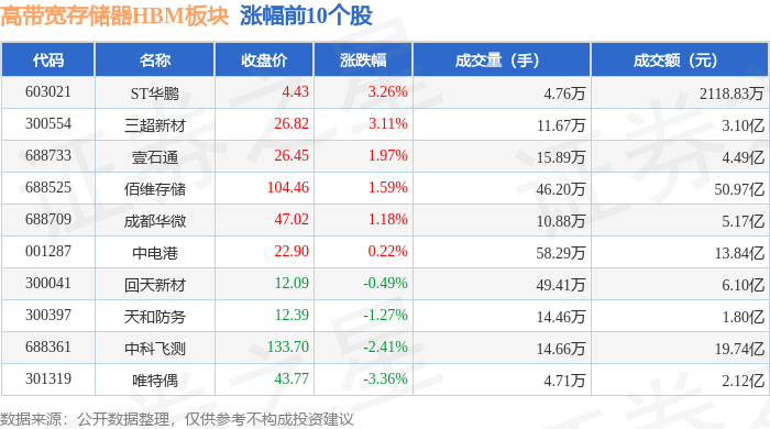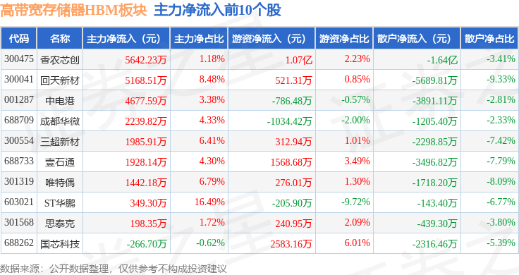从资金流向上来看,当日高带宽存储器HBM板块主力资金净流出42.49亿元,游资资金净流入17.51亿元,散户资金净流入24.98亿元。高带宽存储器HBM板块个股资金流向见下表: