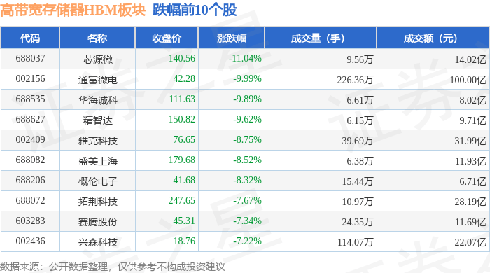 证券之星消息,10月14日高带宽存储器HBM板块较上一交易日下跌6.34%,芯源微领跌。当日上证指数报收于3865.23,下跌0.62%。深证成指报收于12895.11,下跌2.54%。高带宽存储器HBM板块个股涨跌见下表: