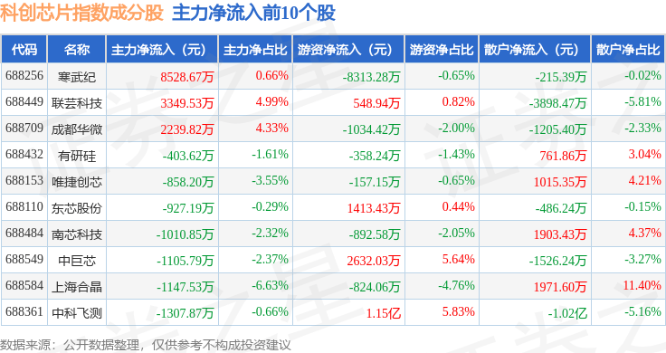 资金流向方面,科创芯片(000685)指数成份股当日主力资金净流出合计86.28亿元,游资资金净流入合计60.25亿元,散户资金净流入合计26.03亿元。成份股资金流向详情见下表: