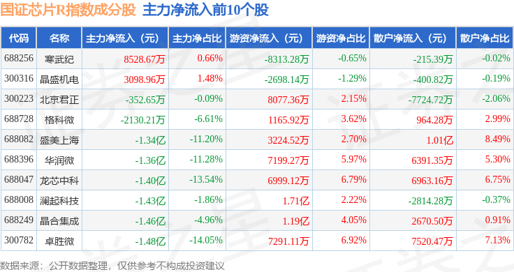资金流向方面,国证芯片R(480017)指数成份股当日主力资金净流出合计123.48亿元,游资资金净流入合计71.26亿元,散户资金净流入合计52.22亿元。成份股资金流向详情见下表: