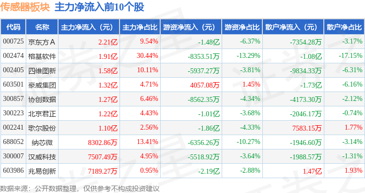 从资金流向上来看,当日传感器板块主力资金净流入2.0亿元,游资资金净流出11.6亿元,散户资金净流入9.59亿元。传感器板块个股资金流向见下表:
