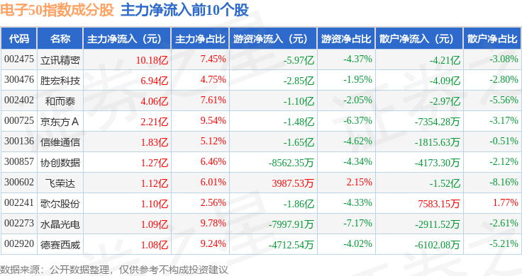 资金流向方面,电子50(399281)指数成份股当日主力资金净流入合计24.03亿元,游资资金净流出合计14.25亿元,散户资金净流出合计9.78亿元。成份股资金流向详情见下表: