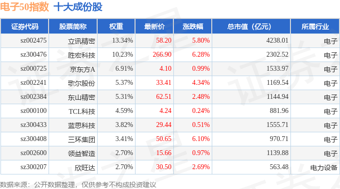 证券之星消息,10月15日,电子50(399281)指数报收于4485.47点,涨3.4%,成交922.88亿元,换手率2.78%。当日该指数成份股中,上涨的有45家,长盈精密以14.19%的涨幅领涨,下跌的有5家,江丰电子以4.36%的跌幅领跌。