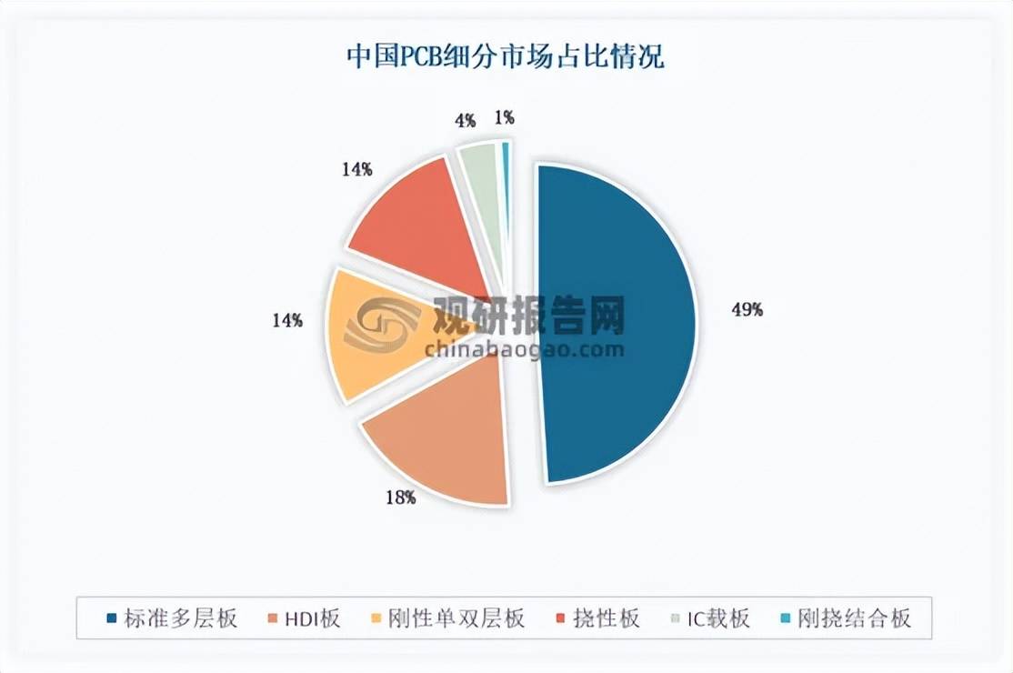目前,中国大陆PCB产能集中于中低端领域,从PCB行业细分产品占比来看,中国PCB市场中刚性板的市场占比最高,达81%,包括多层板、刚性单双面板以及HDI板等多种类型;挠性板、封装基板和刚挠结合板占比较低,分别为14%、4%和1%。