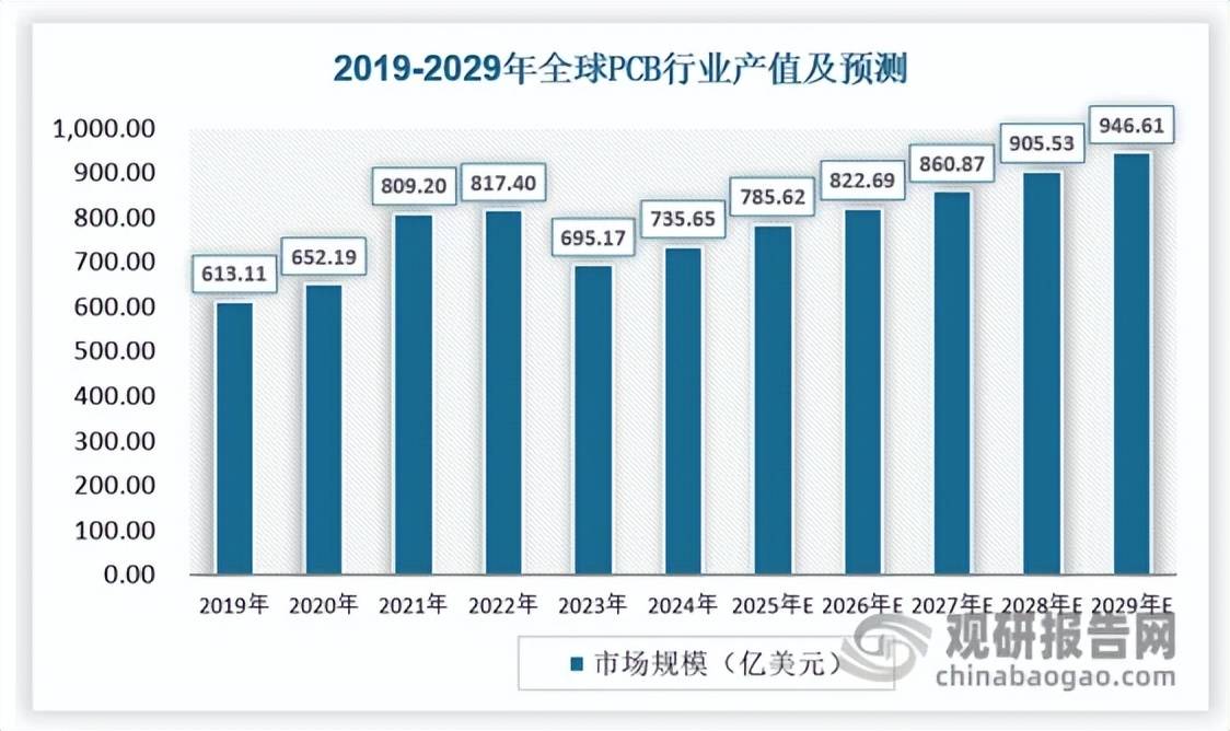 在经历2023年全球PCB行业因宏观经济波动、消费电子需求萎缩导致的阶段性调整后,随着全球经济逐步企稳,加之AI技术革新带来的产业升级机会,以及新能源汽车的快速增长,消费电子行业市场需求回暖,2024年,行业迎来了复苏的拐点,开启了新一轮增长周期。根据知名机构Prismark预测,2024年整体PCB市场产值为735.65亿美元,同比增长5.8%。未来,随着AI技术加速向终端设备渗透,全球AI端侧产品的爆发将成为PCB行业结构性升级的重要推手。根据Prismark数据,2025年至2029年之间,全球PCB行业产值仍将以4.8%的年复合增长率成长,到2029年预计超过940亿美元。