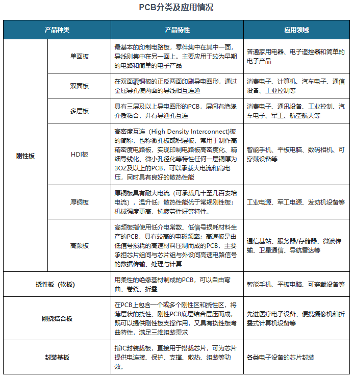 PCB种类丰富,针对不同应用场景。按照产品结构,PCB可分为刚性板、挠性板、刚挠结合板、封装基板,其中刚性板由不易弯曲、具有一定强韧性的刚性基材制成;挠性板由柔性绝缘基材制成印制电路板;刚挠结合板在一块印制电路板上包括一个或多个刚性区和挠性区;封装基板可直接搭载芯片,提供电连接、保护、支撑、散热、组装等功效。同时,按照层数分类,刚性板可分为单层板、双层板和多层板,而当PCB密度超过八层板后采用HDI板将更加具备成本优势,市场上的HDI板主要包括低阶(一阶、二阶)、高阶(三阶以上)、AnylayerHDI、SLP四种类型。其中一阶指相邻两层连接,二阶指相邻三层互联,四阶及以上需要用到AnylayerHDI(任意层之间均有连接),进一步采用半加成法(mSAP)和载板工艺的AnylayerHDI即类载板(Substrate-likePCB,简称SLP)。此外刚性板当中还有部分针对特殊用途的PCB板,包括厚铜板、高频/高速板、金属基板等。从应用领域上看,随着下游领域的发展,对于PCB的要求也逐步提高,PCB结构逐步走向复杂化,例如军工、航空航天领域多采用多层板,智能手机、平板电脑、数码相机逐步采用HDI板,先进医疗电子设备、便携摄像机、折叠式计算机设备等多采用刚挠结合板。