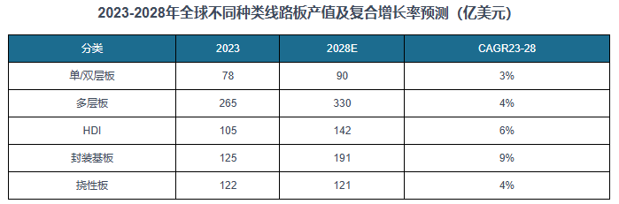 我国PCB厂商产品逐步向高端化迈进。近年来,我国头部厂商积极把握通信、服务器和数据存储、新能源和智能驾驶等市场的结构性需求,已经着手研发并量产高速多层板、HDI板、封装基板和挠性板等高端产品。根据Prismark报告显示,2023-2028年中国多层板、HDI板、封装基板和挠性板四大产品产值呈稳步增长趋势:多层板中,18层以上的多层板产值增速最快,5年CAGR约9%;HDI板产值全球增速最高,5年CAGR达6%;封装基板、挠性板5年CAGR约为7%、4%。