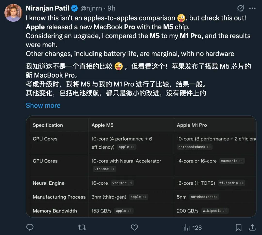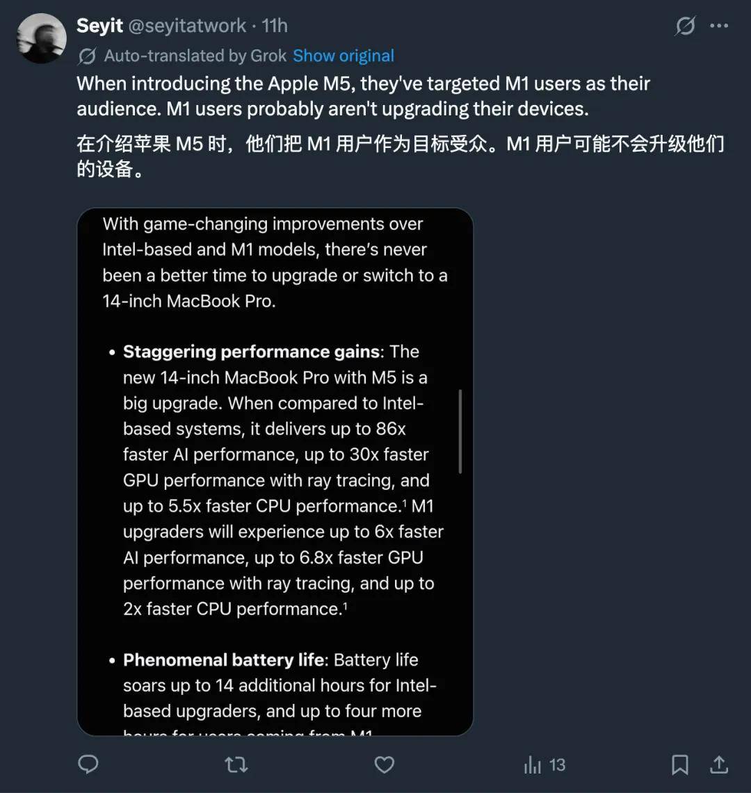 而这些人可能恰恰就是 M5 的目标群体,因为苹果的通稿中一直把 M5 的性能与 M1 对比,这让网友感到无语。
