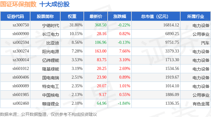 证券之星消息,10月16日,国证环保(399358)指数报收于5557.22点,涨0.69%,成交996.6亿元,换手率1.33%。当日该指数成份股中,上涨的有22家,阳光电源以7.66%的涨幅领涨,下跌的有18家,上海电气以3.7%的跌幅领跌。