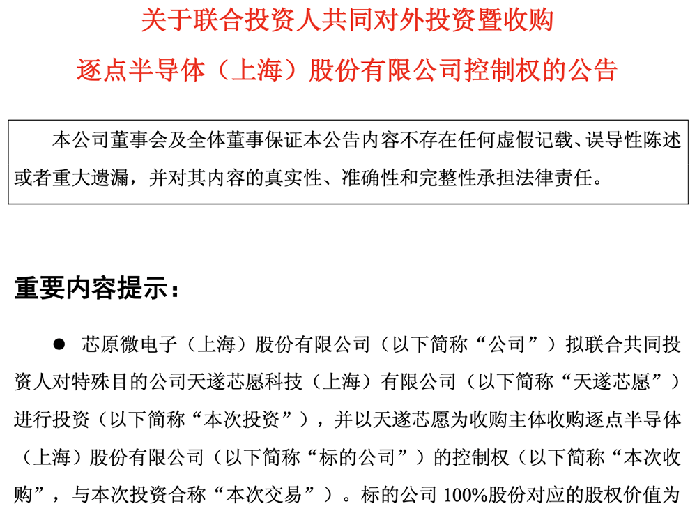 芯东西10月16日报道,10月15日,上海半导体IP龙头企业芯原股份发公告宣布,拟联合共同投资人对特殊目的公司上海天遂芯愿进行投资,并以天遂芯愿为收购主体收购逐点半导体(上海)股份有限公司的控制权。逐点半导体100%股份对应的股权价值为9.5亿元。