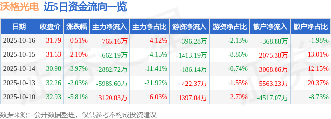 证券之星消息,截至2025年10月16日收盘,沃格光电(603773)报收于31.79元,上涨0.51%,换手率2.58%,成交量5.79万手,成交额1.86亿元。