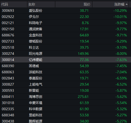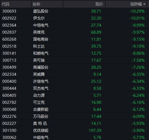 新能源全线下挫,光伏、储能、充电桩概念跌幅居前。在储能概念股中,盛弘股份、伊戈尔、科陆电子等跌停。通润装备、金盘科技、雄韬股份、科士达等跌幅居前。