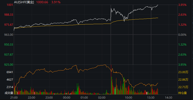 沪金期货主力合约升破1000元整数关口,现涨近4%,续创历史新高,年内涨超370元,涨幅超60%。