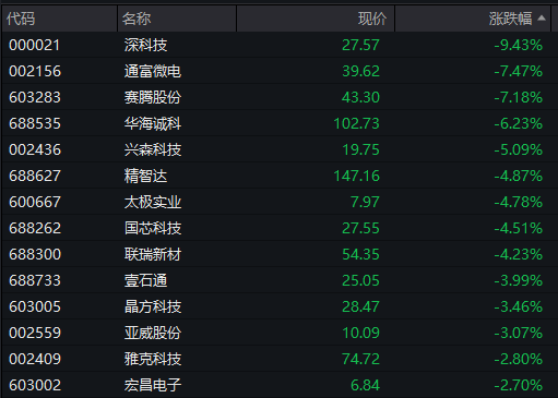 在AI硬件股中,HBM等概念股跌幅居前,深科技跌超9%,通富微电、赛腾股份、华海诚科等走低。