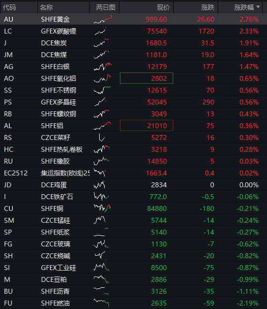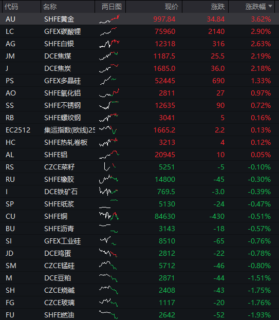 商品:国内商品期货分化,截至发稿,沪金涨超3%,碳酸锂、焦炭、焦煤、沪银涨超2%,多晶硅、氧化铝、不锈钢、螺纹钢、集运指数、热卷板等走高,菜籽、橡胶、铁矿石、纸浆、沪铜、沥青、工业硅、锰硅、鸡蛋等下跌,豆粕、烧碱、玻璃、燃油等跌超1%。