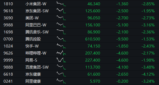 大型科技股集体走低大市承压明显,其中,百度跌3.6%,阿里巴巴跌超3%,小米、美团、快手、京东均跌超2%以上,网易、腾讯跌超1%。