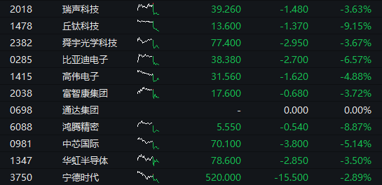 恒生科技指数跌3%,恒生指数跌1.7%。中兴通讯大跌11%,比亚迪电子跌超6%,中芯国际跌超5%。