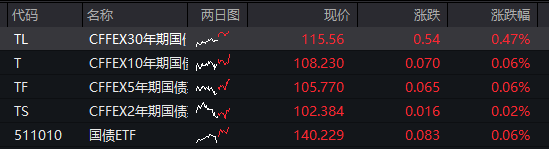 债市:国债期货全线走高,截至发稿,30年期主力合约涨0.47%,10年期主力合约涨0.06%,5年期主力合约涨0.06%,2年期主力合约涨0.02%。