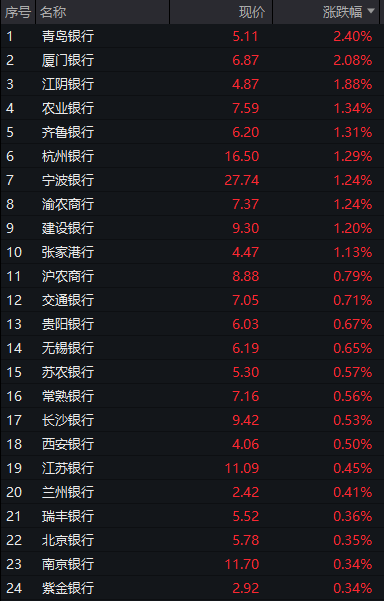 具体来看,银行股逆势飘红,板块指数7连阳。青岛银行、厦门银行涨超2%,农业银行、齐鲁银行、杭州银行等跟涨。