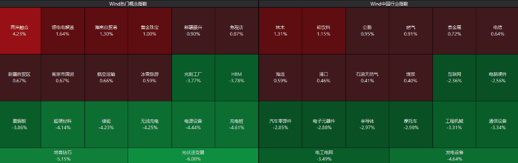 盘面上,个股跌多涨少,沪深京三市约4000股飘绿,上午全市场成交1.19万亿,沪深两市半日成交额1.18万亿,较上个交易日缩量326亿。板块方面,银行、燃气、贵金属、航运港口、煤炭等板块领涨;下跌方面,风电、光伏、数据中心电源、超硬材料、液冷服务器等板块领跌。