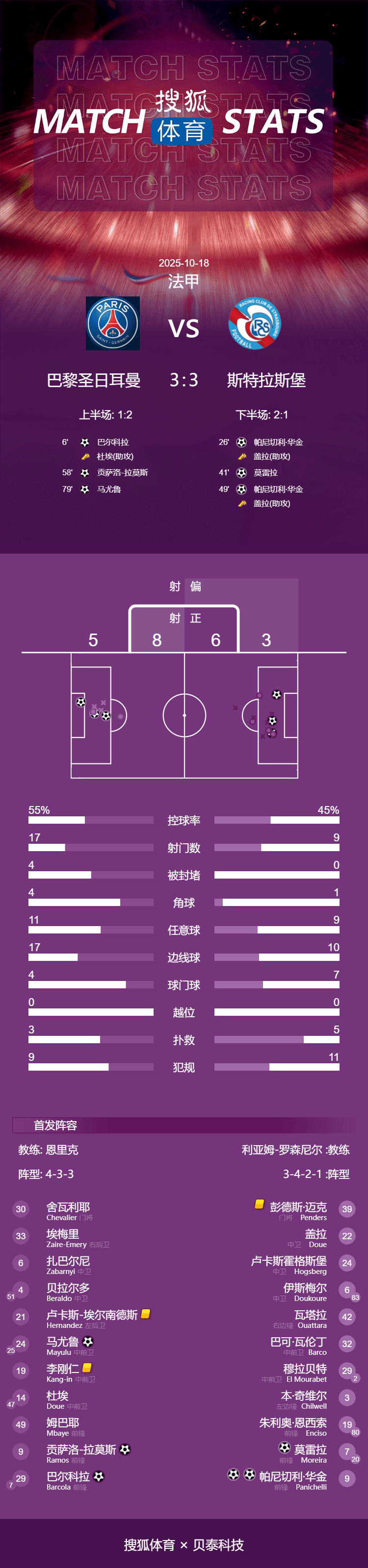 北京时间10月18日凌晨02时45分,2025-26赛季法甲联赛第8轮展开角逐,卫冕冠军巴黎圣日耳曼坐镇王子公园球场3-3险平斯特拉斯堡,取得两连平,巴尔科拉开赛6分钟为巴黎圣日耳曼取得梦幻开局,帕尼切利在上下半场各入一球,莫雷拉上半场尾声破门,斯特拉斯堡一度客场3-1领先。贡萨洛-拉莫斯和马尤卢下半场连入两球,帮助球队惊险拿到1分。