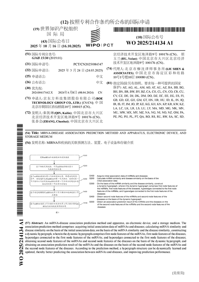 证券之星消息,根据企查查数据显示京东方A(000725)公布了一项国际专利申请,专利名为“MIRNA和疾病的关联预测方法、装置、电子设备和存储介质”,专利申请号为PCT/CN2025/084347,国际公布日为2025年10月16日。