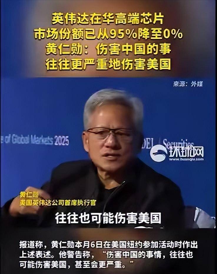 然而,美国此项船舶政策的影响,远不如中国实施的稀土管制政策。稀土管制无疑是更具威胁的“杀手锏”。英伟达的CEO黄仁勋在10月17日的一次活动中公开表示,由于美国的出口管制,英伟达在中国的市场份额已经从原先的95%降到了0%,这意味着英伟达实际上已经退出了中国市场。尽管英伟达为绕过中国禁令推出了“阉割版”AI芯片H20,但这款芯片在中国市场依旧无法销售。