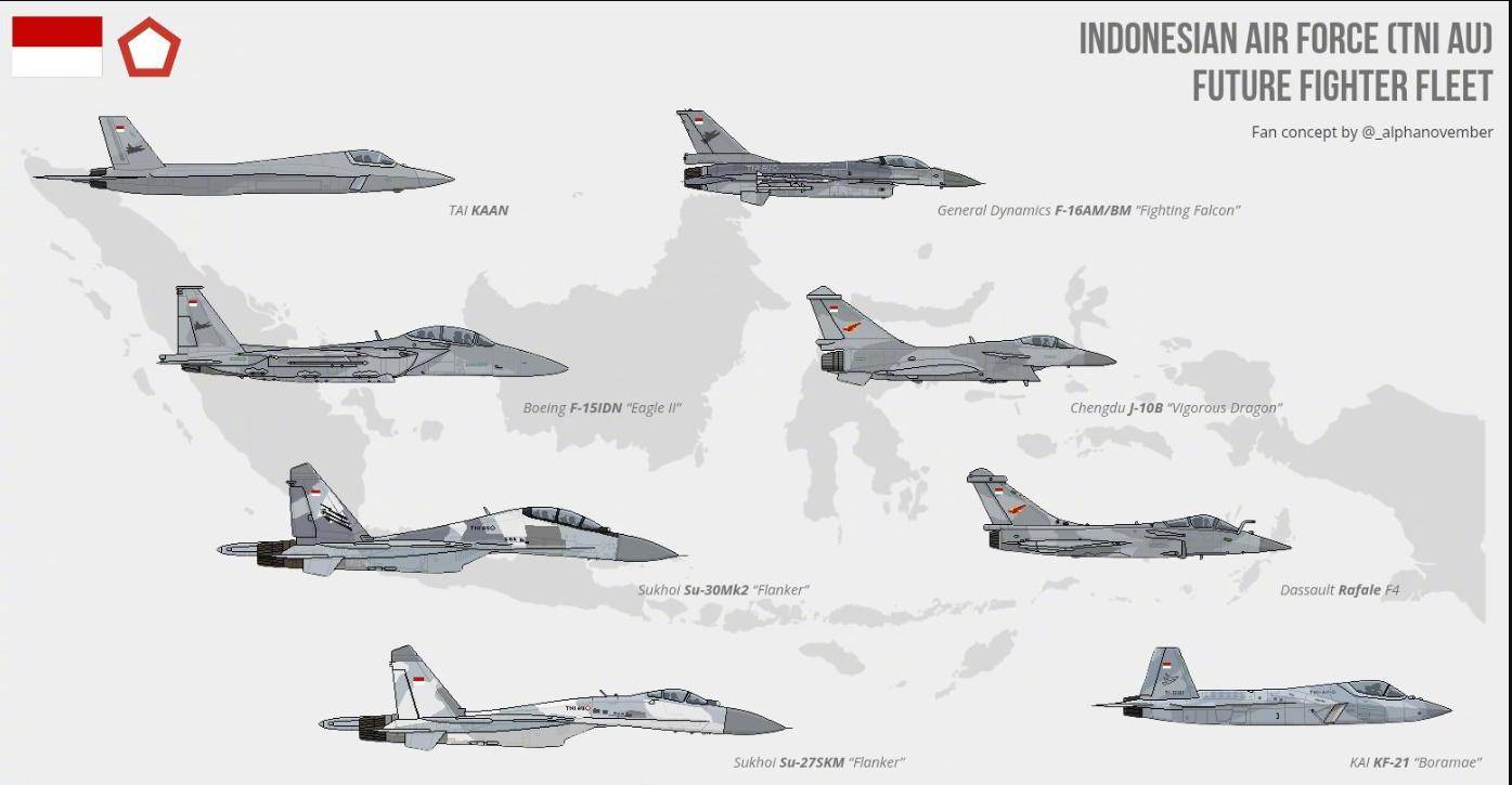 现在印尼手头的军用飞机来源已经非常庞杂了,法国阵风战斗机的这个订单没有取消,印尼就直接订购中国的歼-10战斗机了,说明印尼空军看到印巴空战后,对法国阵风战斗机性能不放心。印尼未来空军可能的阵容,世界大部分战斗机都快收集齐了,美国推销F-15EX、F-16V战斗机,法国阵风战斗机,中国歼-10战斗机,韩国的KF-21战斗机,土耳其可汗战斗机等,可以说都在抢夺印尼空军的订单。印尼一开始是投资韩国的KF21半隐身战斗机计划,后来它们改变想法,与土耳其达成协议,想购买后者的可汗牌隐形战斗机。现在来看,印尼空军对这两款战斗机都不放心,包括未来量产,性能,何时交付。