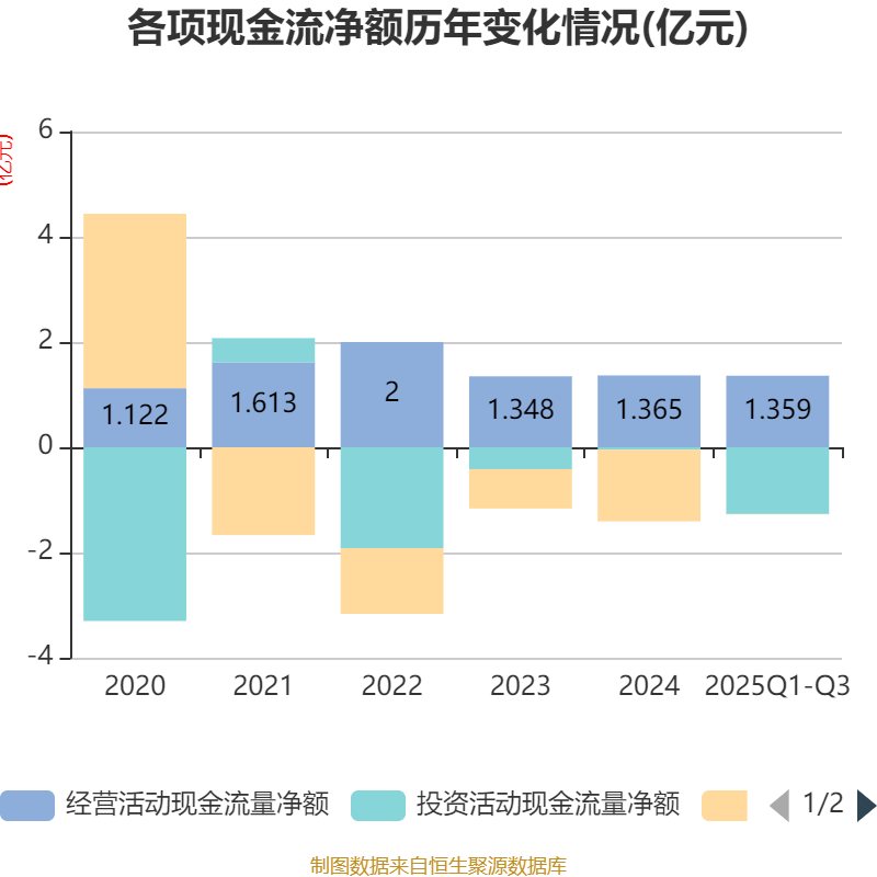2025年前三季度,公司经营活动现金流净额为1.36亿元,同比增长57.18%;筹资活动现金流净额-71.52万元,同比增加1.19亿元;投资活动现金流净额-1.27亿元,上年同期为-352.06万元。