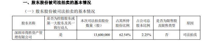 10月20日,得润电子(002055.SZ)发布公告,公司控股股东深圳市得胜资产管理有限公司持有的1360万股(占公司总股本的2.25%)将被司法拍卖。拍卖将于2025年11月20日10时至2025年11月21日10时通过深圳市宝安区人民法院淘宝网司法拍卖网络平台进行。