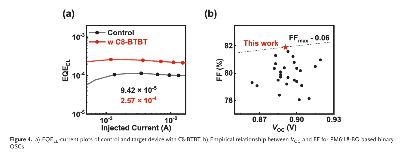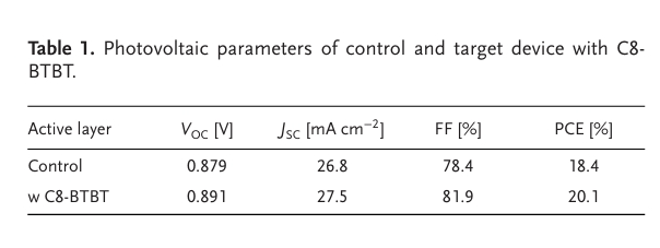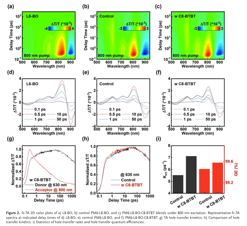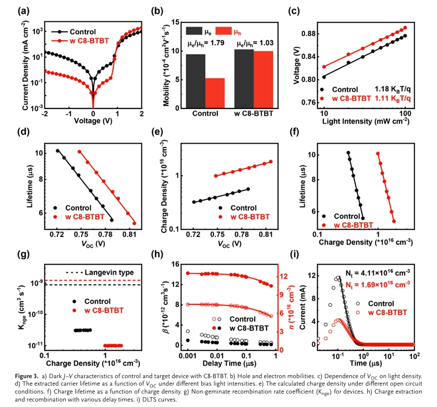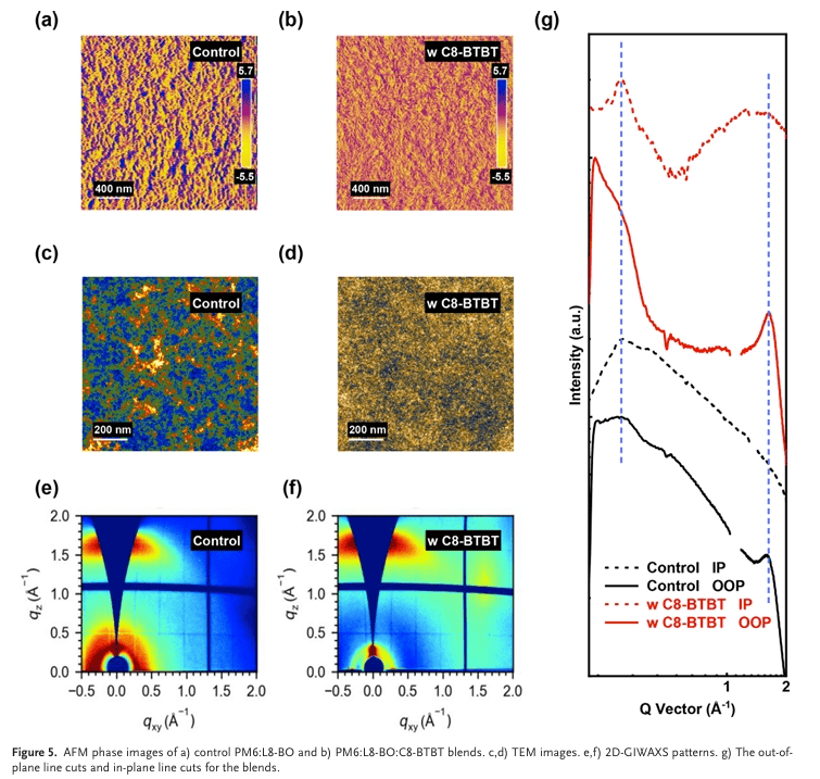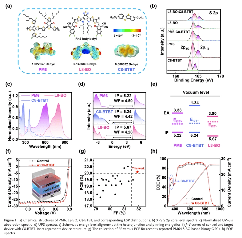 在该策略中,团队向由聚合物给体PM6和非富勒烯受体L8 - BO构成的二元体系里,引入了高度结晶的p型有机半导体C8 - BTBT作为固体添加剂。这一创新举措旨在同时改善电荷动力学特性以及光活性层的相形貌。